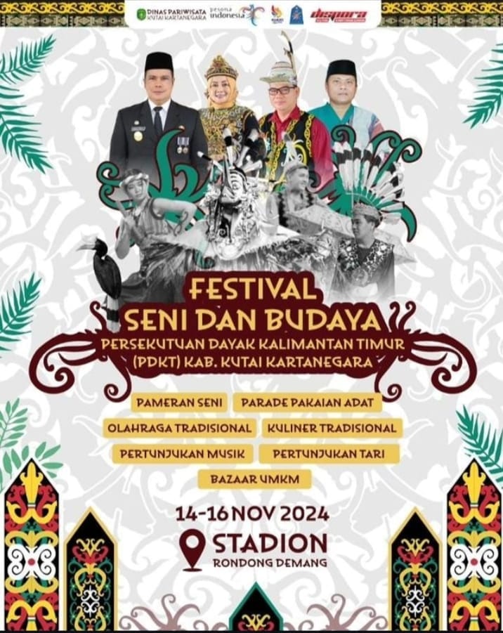 Fajarnews.co, Kutai Kartanegara – Festival Seni dan Budaya Persekutuan Dayak Kalimantan Timur (PDKT) 2024, yang digelar di area parkir Stadion Rondong Demang, Tenggarong, Kabupaten Kutai Kartanegara (Kukar), pada Kamis 14 hingga 16 November.