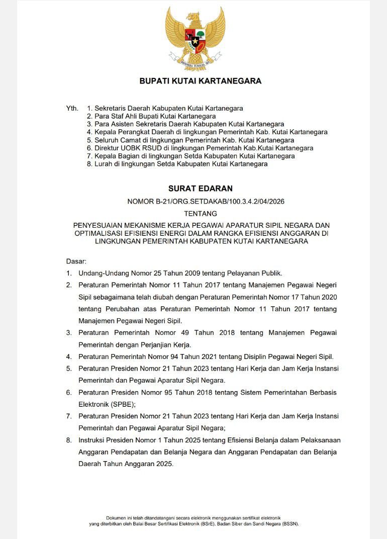 Fajarnews.co,Kutai Kartanegara, Kamis (02/04/2026) – Pemerintah Kabupaten Kutai Kartanegara mulai memberlakukan pola kerja baru bagi aparatur sipil negara (ASN) dengan mengombinasikan sistem kerja dari kantor (WFO) dan dari rumah (WFH). Kebijakan ini tertuang dalam Surat Edaran Bupati Kukar Nomor B-21/ORG.SETDAKAB/100.3.4.2/04/2026 yang diterbitkan pada 1 April 2026.